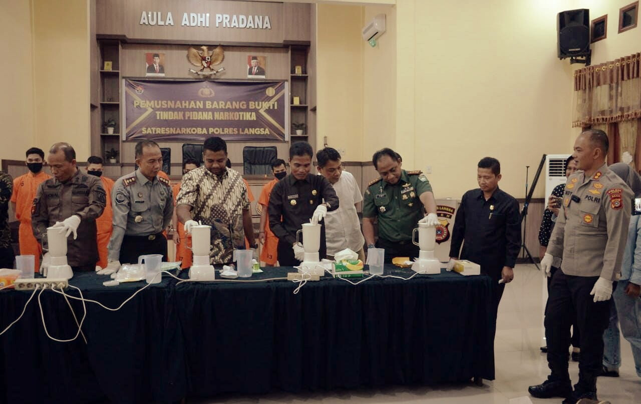 LANGSA | Pj. Walikota Langsa Syaridin, S.Pd, M.Pd ikuti pemusnahan barang bukti sabu yang di gelar Polres Langsa, dengan cara diblender yang disita mulai September 2023 hingga Januari 2024 seberat 3.308,75 gram sabu yang disita dari 10 tersangka di Aula Adhi Pradana Mapolres Langsa, Kamis 25 Januari 2024.