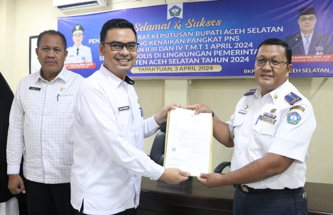 Ia menambahkan, Penyerahan Surat Keputusan Kenaikan Pangkat PNS Golongan II, III dan IV, TMT 01 April 2024 di Lingkungan Pemerintah Kabupaten Aceh Selatan diserahkan pada hari ini bertempat di Kantor Badan Kepegawaian dan Pengembangan Sumber Daya Manusia Kabupaten Aceh Selatan.