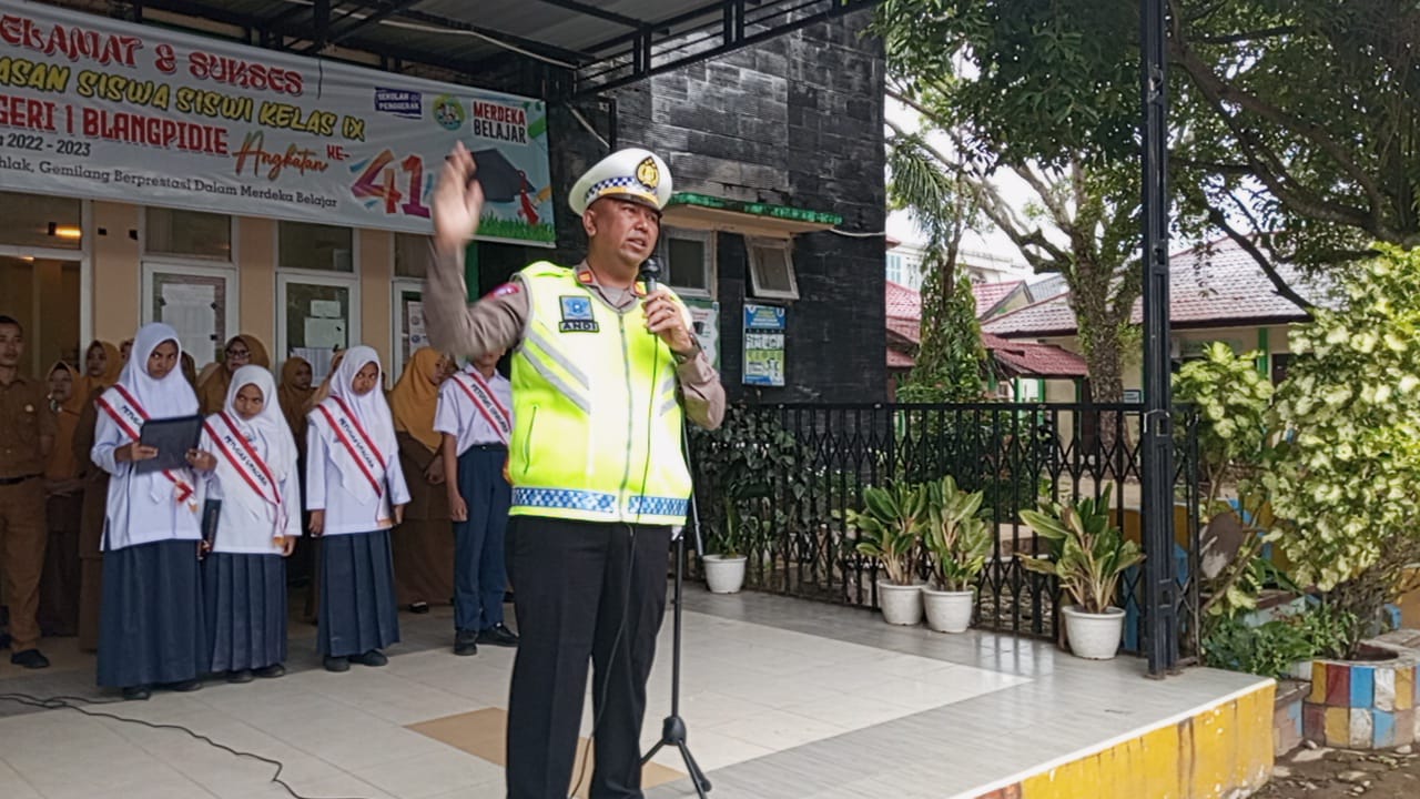 ABDYA | Polantas Saweu Sikula, Satlantas Polres Aceh Barat Daya (Abdya) himbau kepada siswa siswi tertib berlalu lintas,jauhi bahaya narkoba, dan bijak menggunakan medsos. Senin (14/8/2023).