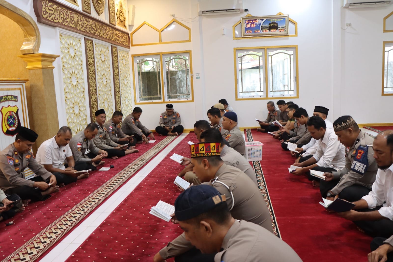 Kegiatan yang berlangsung khidmat tersebut dipimpin oleh Ustadz Mulyadi Ali, S.Pd., dan digelar di Masjid Babuttaqwa Polres Aceh Selatan usai pelaksanaan sholat Ashar berjamaah, Senin (2/3/2026).
