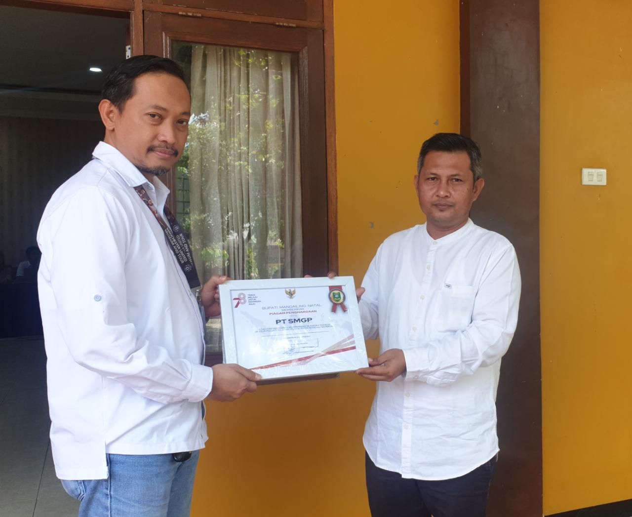 Piagam penghargaan tersebut diberikan Bupati Madina HM. Jafar Sukhairi Nasution. Bupati mengucapkan terima kasih kepada PT SMGP karena telah ikut berpartisipasi membantu pendidikan masyarakat melalui program beasiswa bagi mahasiswa berprestasi.