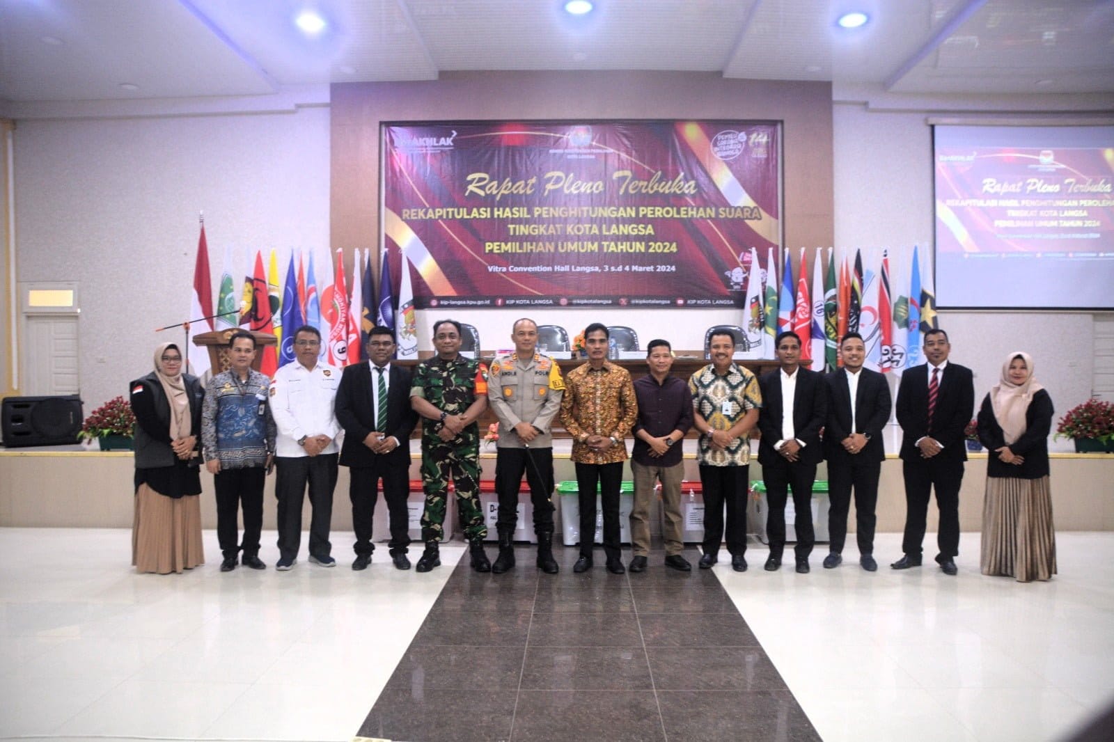 Hadir dalam rapat rekapitulasi hasil perhitungan perolehan suara diantaranya Pj. Walikota Langsa, Syaridin SPd MPd, Ketua DPRK Langsa Maimul Mahdi SSos, Kapolres Langsa AKBP Andy Rahmansyah SIK SH MH, Dandim 0104/Aceh Timur Letkol. Inf. Tri Purwanto SIP, ketua pengadilan negeri Langsa Dini Damayanti SH, ketua KIP Kota Langsa, Ridwan, komisioner Bawaslu kota Langsa serta ketua Parpol dan tamu lainnya.