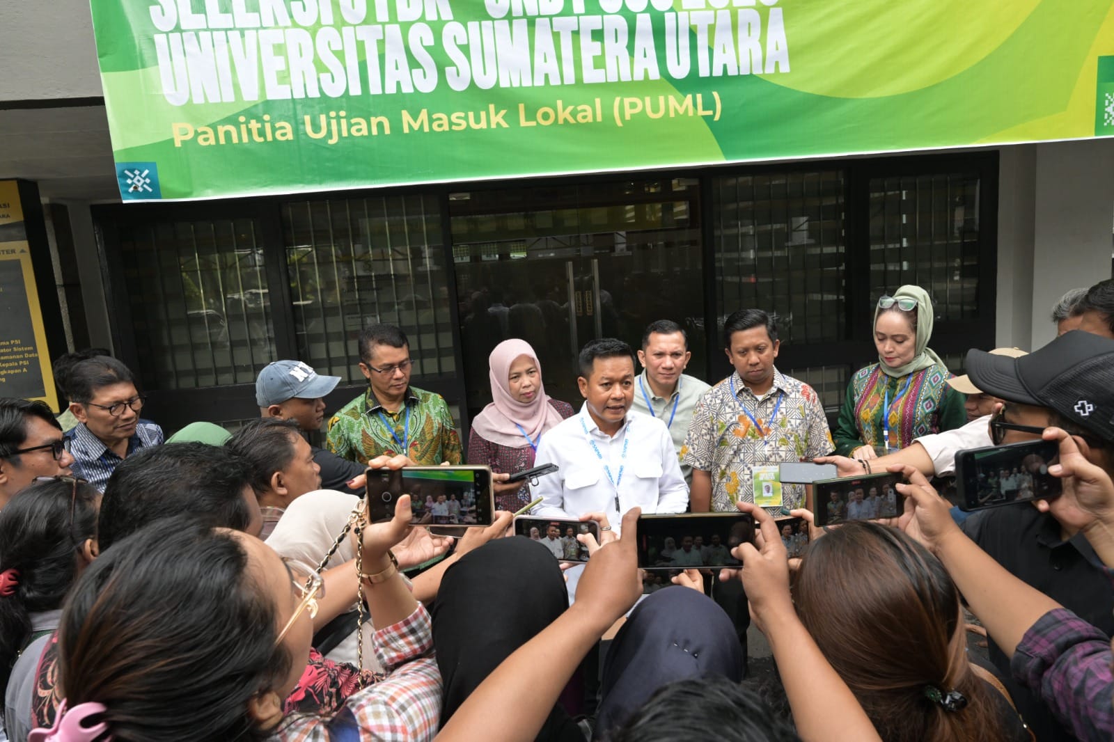 MEDAN | Rektor Universitas Sumatera Utara (USU), Prof Dr Muryanto Amin, S.Sos., M.Si., didampingi para Wakil Rektor dan panitia meninjau langsung pelaksanaan hari pertama Ujian Tulis Berbasis Komputer Seleksi Nasional Berdasarkan Tes (UTBK-SNBT) USU 2026 di sejumlah lokasi ujian di kampus USU, jalan dr T Mansur, Medan, Selasa (21/4/2026).