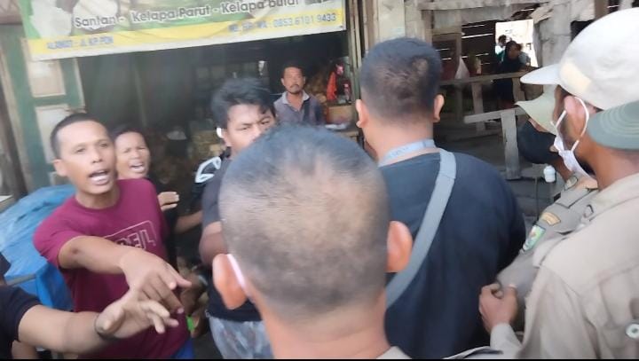 Bentrokan nyaris terjadi gara gara seorang pedagang melemparkan meja jualanya dan hampir mengenai petugas Satpol PP.