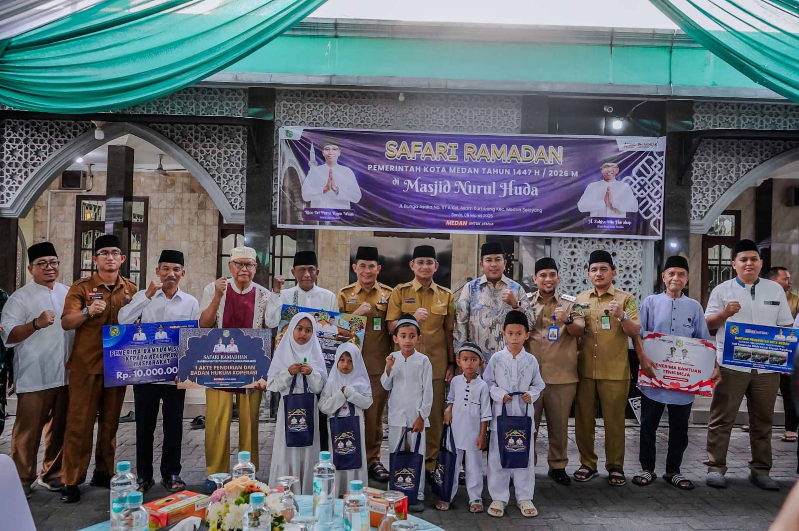 MEDAN | Pemerintah Kota (Pemko) Medan menyalurkan berbagai bantuan untuk mendukung kemakmuran masjid dan kesejahteraan masyarakat saat menggelar Safari Ramadan di Masjid Nurul Huda, Jalan Bunga Asoka, Kelurahan Asam Kumbang, Kecamatan Medan Selayang, Senin (9/3/2026).