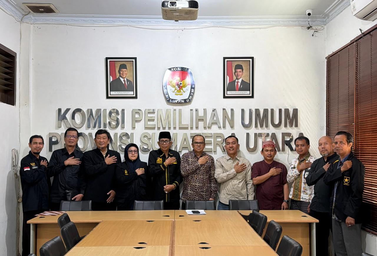 MEDAN | Jajaran kepengurusan DPW Partai Ummat Sumut menyambangi Kantor KPU Provinsi Sumut. Kedatangan mereka disambut Ketua dan anggota KPU Provsu Agus Arifin Kotaris Banurea, Raja Ahab Damanik, Jhon Rahmat Fredianus Zebua, Kasubag Teknis Agus dan Kasubag Parmas Ririn.