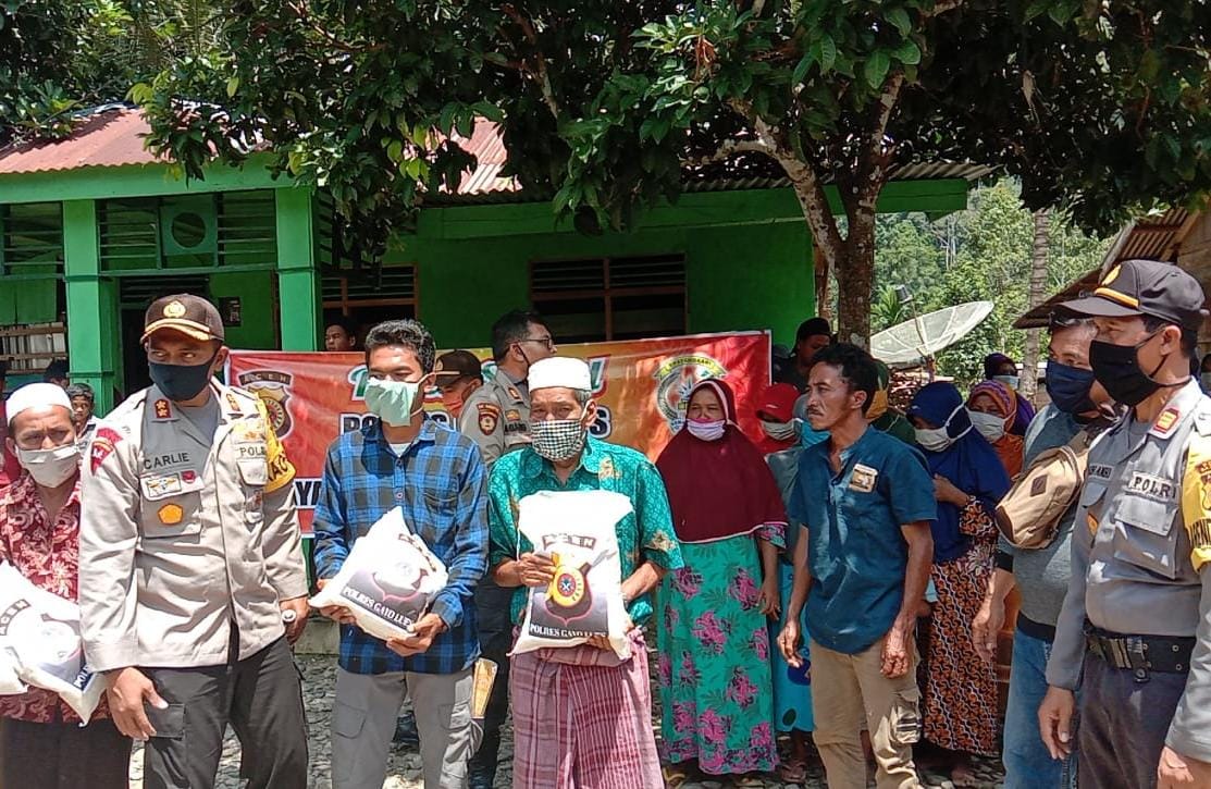 GAYO LUES – Kapolres Gayo Lues, AKBP Carlie Syahputra Bustaman SIK, memberikan bantuan sembako terhadap masyarakat di pedalaman Lesten, Kecamatan Pining berupa beras kepada 82 Kepala Keluarga (KK).