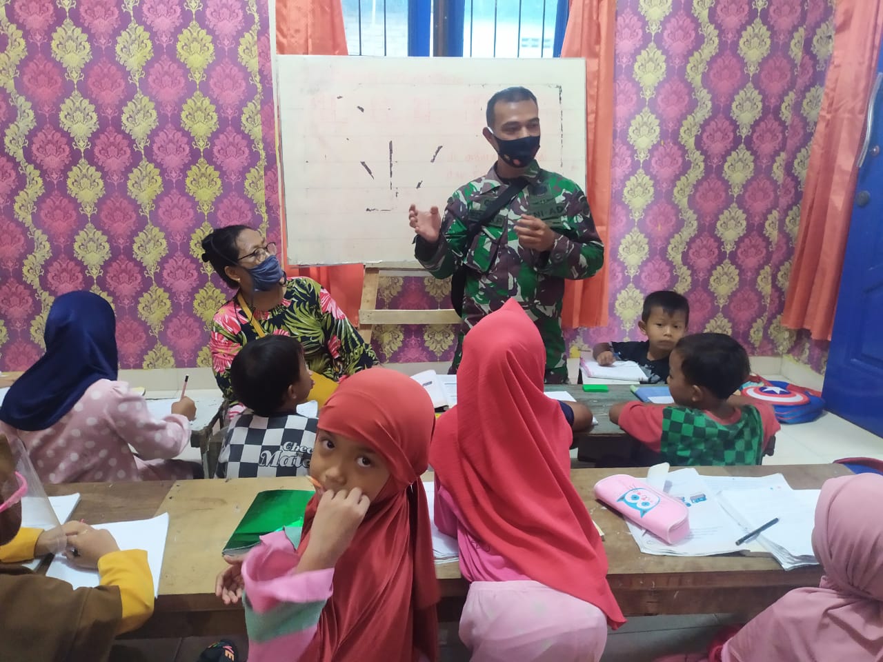MEDAN – Anggota Satgas TMMD Ke 109 Kodim 0201/BS Serma Edi Syahputra melaksanakan komunikasi sosial dengan menyambangi Klas Les Guru pengajar Ibu Lasmini (40) Guru SDN 065004 di Gang Arjuna Lingkungan 10, Kelurahan 600, Kecamatan Medan Marelan, Kota Medan.