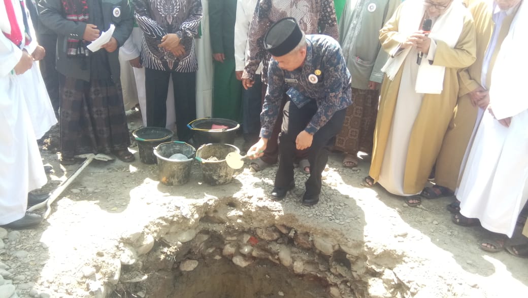 PALAS | Sekertaris Daerah (Sekda) Kabupaten Padang Lawas (Palas) Arpan Nasution S.Sos, meletakkan Batu pertama pembangunan Gapura Majelis Pengkajian Tauhid Tasowuf Indonesia (MPTT- I) Kabupaten Padang Lawas di Desa Mompang Kecamatan Barumun Baru, Kabupaten Padang Lawas, Sumut, Kamis (10/7/2022).