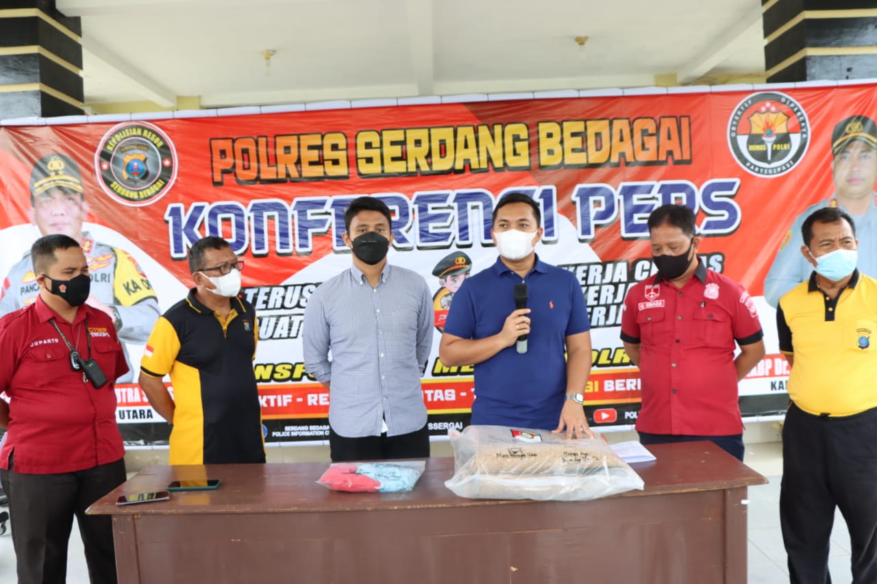 “Pelaku yang diamankan berinisial H (30) warga Kecamatan Dolok Masihul, Kabupaten Serdang Bedagai, Sumatera Utara, di tangkap pada hari Rabu (8/12/2021) sekira pukul 11.00WIB di Pondok Perumahan perkebunan kelapa sawit Desa Sikerabang Kecamatan Longkib, Kab Subulussalam, Aceh,”demikian disampaikan Kasat Reskrim AKP Made Yoga Mahendra,Kasubsi Penmas Iptu Barito Siregar, KBO Sat Reskrim Ipda Bima Prakasa, Kanit PPA Sat Reskrim Ipda H. Sinaga dalam konferensi pers di Maka Polres Sergai, Jumat (10/12/2021) sekira pukul 10.00 WIB.