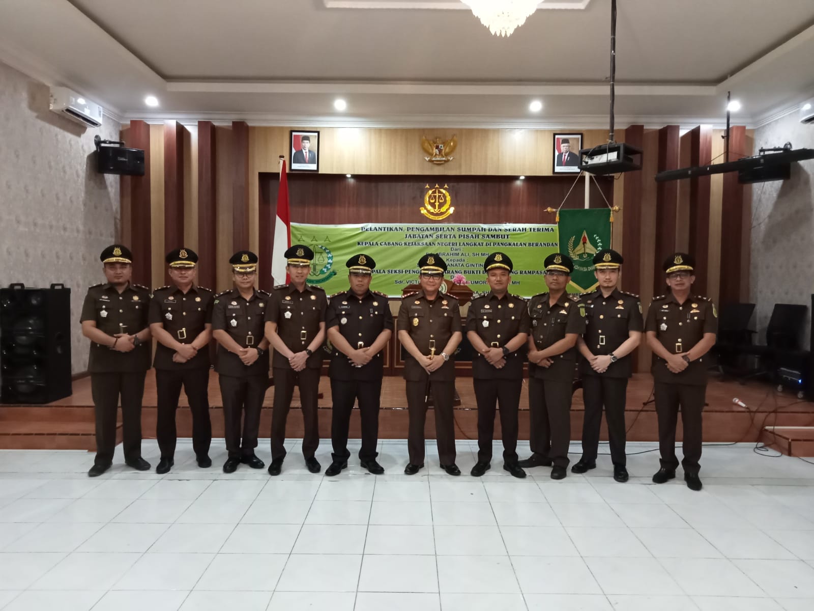 Bahwa pelaksanaan Serah Terima Jabatan tersebut berdasarkan Keputusan Jaksa Agung RI Nomor : KEP-IV-628/C.4/10/2021 tanggal 29 Oktober 2021 yaitu, Kepala Seksi Barang Bukti dan Barang Rampasan dari Victor M Situmorang., S.H., MH kepada Sai Sintong Purba., S.H, dan Kepala Cabang Kejaksaan Negeri Langkat di Pangkalan Brandan dari Ibrahim Ali., S.H., M.H kepada Feri Diananta Ginting., S.H.