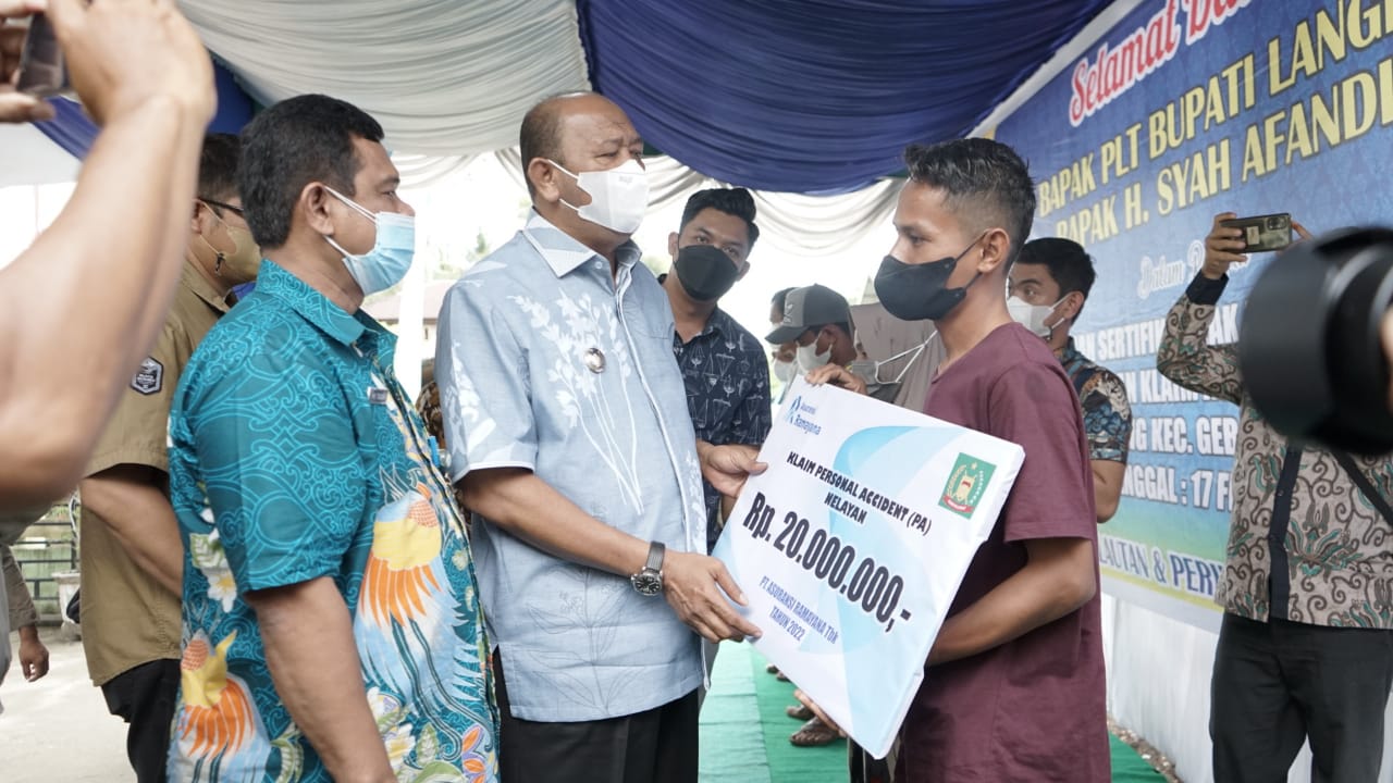LANGKAT I Pelaksana Tugas (Plt) Bupati Langkat H Syah Afandin SH menyerahkan 70 sertifikat hak atas tanah nelayan, serta menyerahkan klaim asuransi nelayan senilai Rp220 juta.