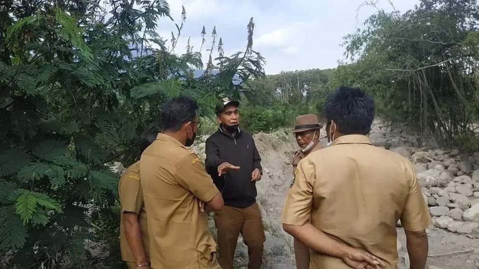 Wakil Bupati Karo Theopilus Ginting turun langsung meninjau normalisasi material lahar dingin yang menumpuk di sepanjang aliran sungai dan lahan warga di Dusun Bekerah, Desa Sukatendel, Kecamatan Tiga Nderket, Selasa (7/9//2021).