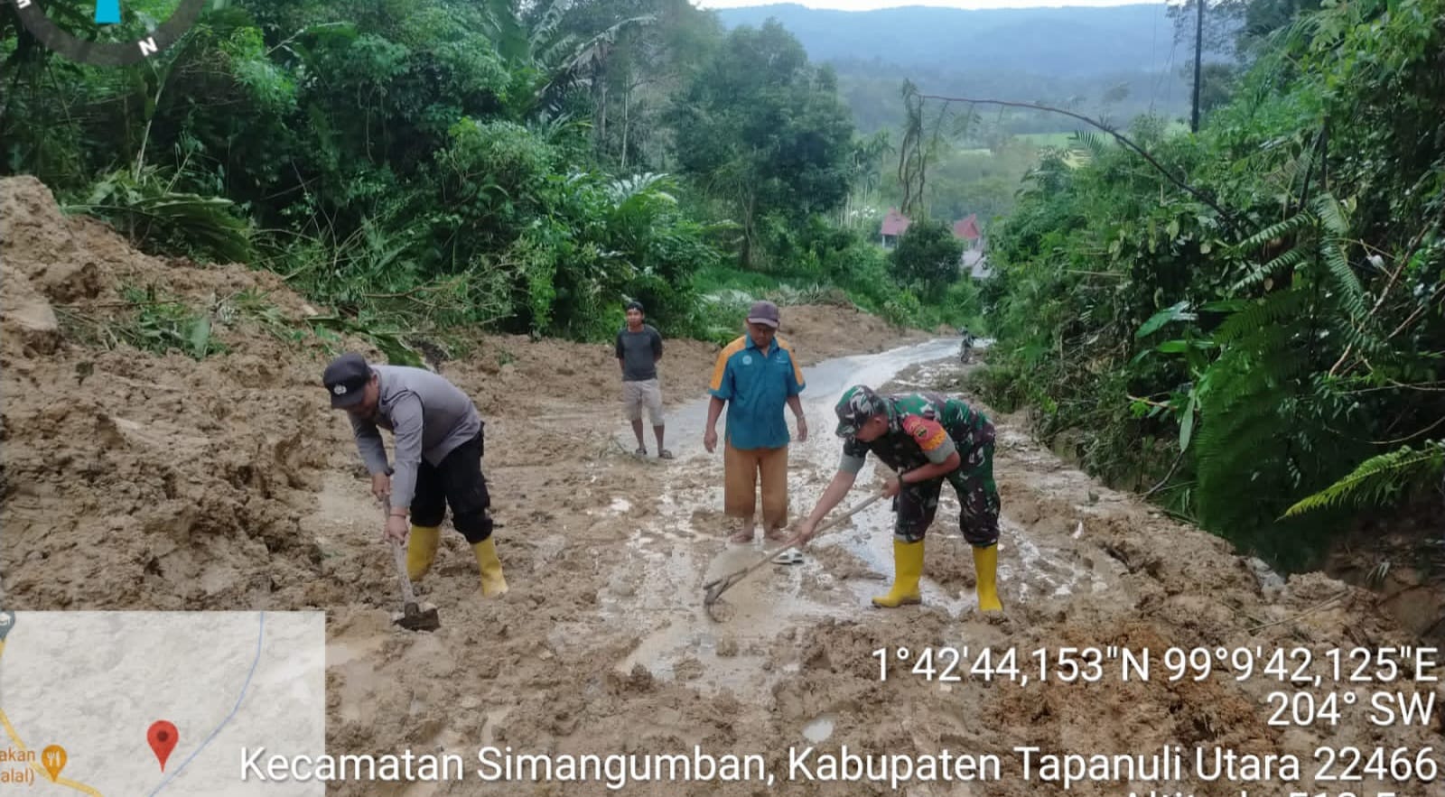 MEDAN | Personil TNI – Polri bergotongroyong membersihkan tumpukan material pascabanjir dan longsor cukup parah melanda 3 desa di Kecamatan Simangumban – Tapanuli Utara, Sabtu(29/4/2023).