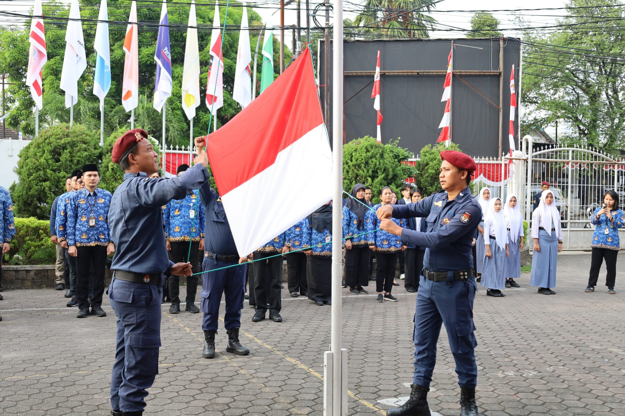 Pengibaran bendera Merah Putih dilaksanakan oleh anggota Pengamanan Dalam (Pandal) KPU Sumut, yakni Lingga, Bari Nasution, dan Faisal.