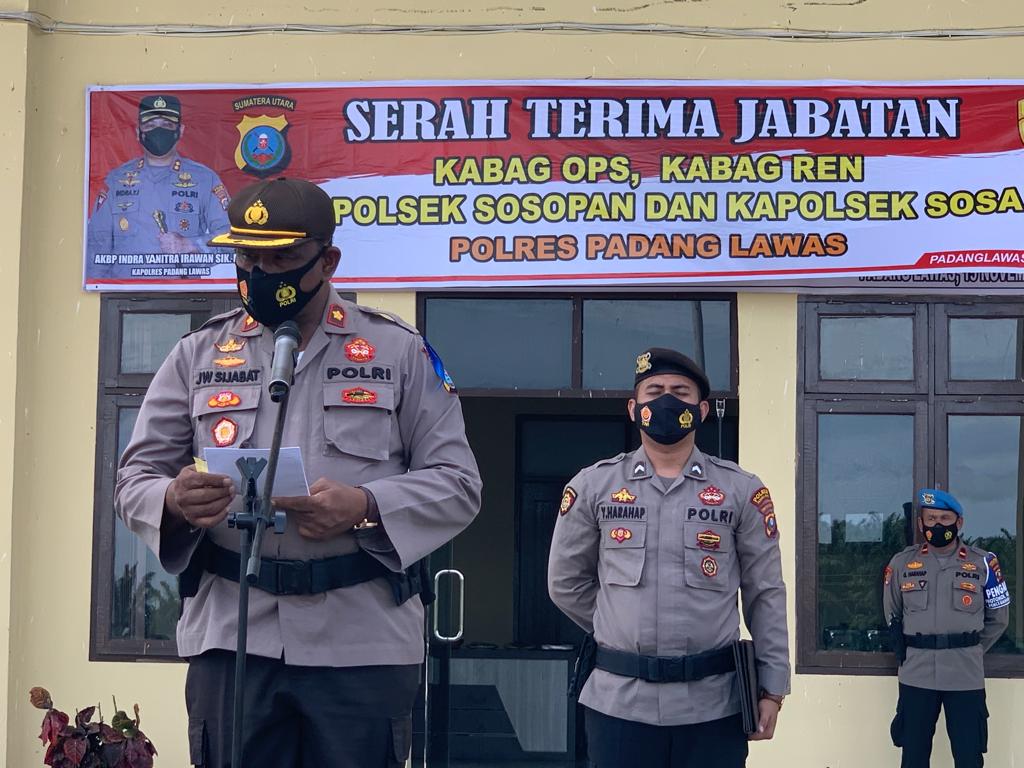 PALAS| Mewakili Kapolres Palas Palas AKBP Indra Yanitra Irawan SIK, M.Si, Wakapolres Kompol JW Sijabat meminpin upacara serah terima jabatan ( Sertijab) Kabag Ops, Kabag Ren, Kapolsek Sosa dan Kapolsek Sosopan, di Plataran Kantor Mapolres Palas, jalan lintas Sibuhuan – Sosa, Desa Bulu Sonik, Kecamatan Barumun, Kamis (18/11/2021)