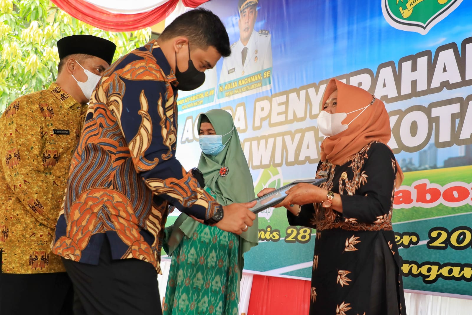 Piagam Penghargaan Adiwiyata secara simbolis ini diserahkan Bobby Nasution kepada tiga sekolah yakni SD Negeri 060925, SD Negeri 064020 dan MIS Insan Ikhlas Islamic School di Halaman SD Negeri 060925, Jalan Sisingamangaraja, Medan Amplas, Kamis (28/10/2021). Seluruh sekolah yang menerima piagam penghargaan Adiwiyata ini merupakan hasil penjaringan Dinas Lingkungan Hidup berkolaborasi dengan Dinas Pendidikan sejak tahun 2020 yang lalu.