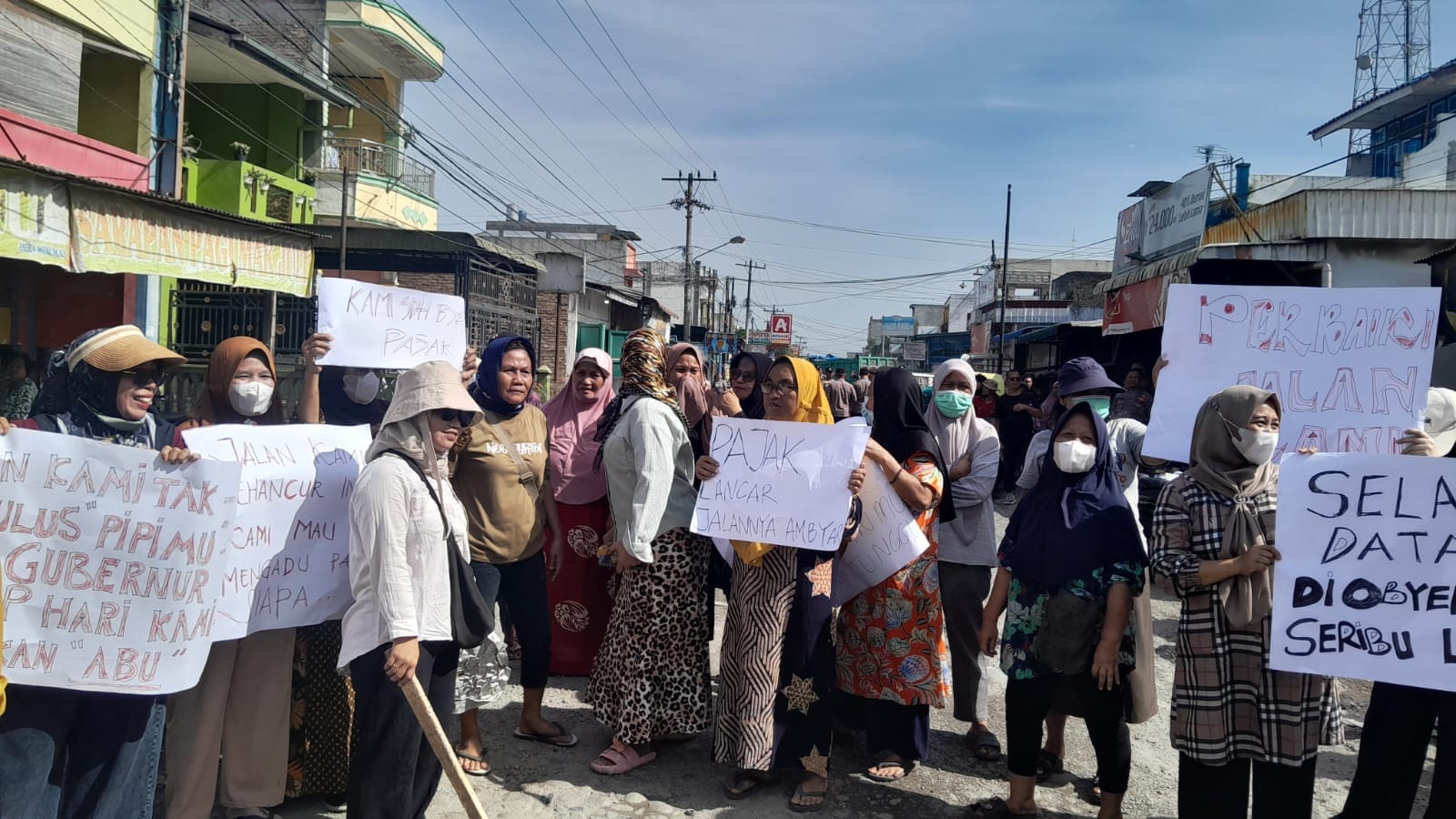 “Ibu-ibu takut bawa anak naik motor lewat sini. Sudah banyak yang jatuh. Pajak kami bayar, tapi jalan dibiarkan rusak,” ungkap Yeni, salah seorang ibu rumah tangga yang turut dalam aksi sambil membawa karton berisi tuntutan mereka.